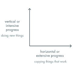 ในขณะที่โลกาภิวัฒน์นั้น เป็นเพียงการนำสิ่งที่ดีอยู่แล้ว ไปปรับใช้ในที่อื่น ๆ ถือเป็นตัวอย่างที่เห็นได้ชัดของการก้าวจากจุด 1 ไปจุด n ดังแผนผังด้านล่าง