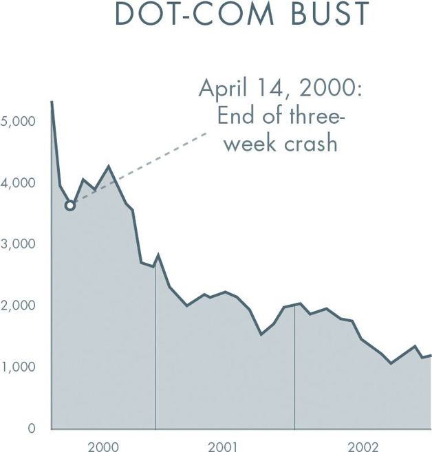 ในช่วงยุค 90 นั้นถือได้ว่าเป็นยุคทองของเทคโนโลยีอินเตอร์เน็ตเลยก็ว่าได้ ทุก ๆ คนล้วนมองโลกในแง่ดี มีความหวัง ซึ่งก็ส่งผลให้บริษัทสตาร์ตอัปต่างระดมเงินทุนได้เป็นกอบเป็นกำ ราคาหุ้นเทคฯ ก็วิ่งสูงเอา ๆ แต่สุดท้ายแล้วก็เหมือนทุกสิ่งทุกอย่างที่วิ่งฉิวมานานบนพื้นฐานบริษัทที่ยังร่อแร่… ในเดือนมีนาคม ปี 2000 ตลาดหุ้น NASDAQ แตะระดับสูงสุดที่ 5,048 จุด ก่อนจะร่วงลงมาเหลือเพียง 3,321 จุดในกลางเดือนเมษายน จากนั้นก็ร่วงลงมาเรื่อย ๆ เหลือเพียง 1,114 จุดในเดือนตุลาคม ปี 2002 (2 ปีทีเดียวที่ตลาดลงอย่างเดียว)