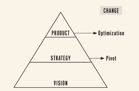ในสามขั้นตอนนี้ โดยปกติแล้ววิสัยทัศน์จะไม่เปลี่ยนเท่าไร ลองคิดภาพคนคนนึงอยากเปลี่ยนโลกไปในทิศทางหนึ่ง ก็คงไม่เปลี่ยนความคิดกันง่าย ๆ หรอกจริงมะ สิ่งที่จะเปลี่ยนก็มีแต่กลยุทธ์และผลิตภัณฑ์นี่แหละ
