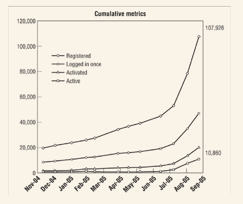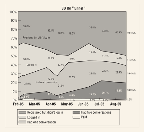 ที่ IMVU นั้น ทีมเคยใช้ Cohort Analysis ในการดูว่าลูกค้าแต่ละ Funnel เพิ่มขึ้น/ลดลงอย่างไรบ้างในระหว่างที่พวกเขาทำการทดลองปรับแก้สิ่งต่าง ๆ โดยกราฟนี้จะแบ่งกลุ่มคนออกเป็นแต่ละเดือน และแตกออกมาเลยว่าในเดือนนั้น ๆ มีอัตราลูกค้าอยู่ที่แต่ละ Funnel คิดเป็นจำนวนกี่ % เมื่อแสดงผลออกมาแบบนี้ ก็จะทำให้เห็นชัดว่า Segment ไหนพัฒนาได้ดี Segment ไหนยังติดแหง็กอยู่ที่เดิม