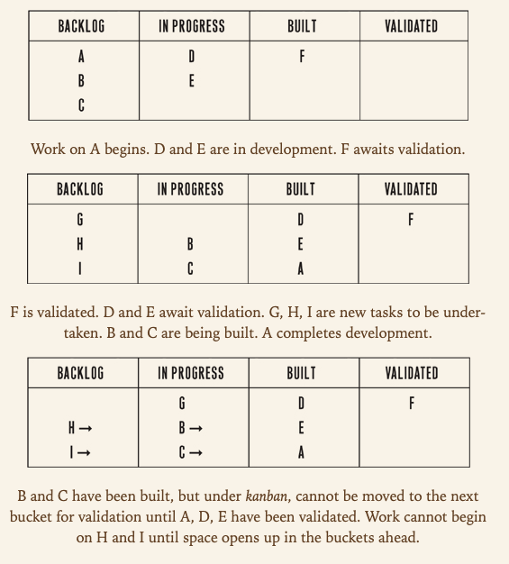 แน่นอนว่าเป็นหน้าที่ของ Product Manager ที่จะต้องทำการเรียงลำดับความสำคัญของงาน อะไรควรออกก่อนออกหลัง แล้วตอนนี้ทีมมี Effort มากน้อยแค่ไหน อีกหนึ่งวิธีที่สามารถช่วยได้คือการใช้ Kanban Board ในการโอนถ่ายงาน ดูจากตารางด้านล่าง สมมติว่าได้กำหนดไว้ว่าแต่ละคอลัมน์ต้องมีไม่เกิน 3 งานในช่วงเวลาเดียวกันเพื่อไม่ให้ทีมล้นเกิน คอลัมน์หรือขั้นตอนไหนที่เต็ม ก็ไม่สามารถเอางานเข้าคอลัมน์นั้นได้ ต้องต่อคิวรอไป
