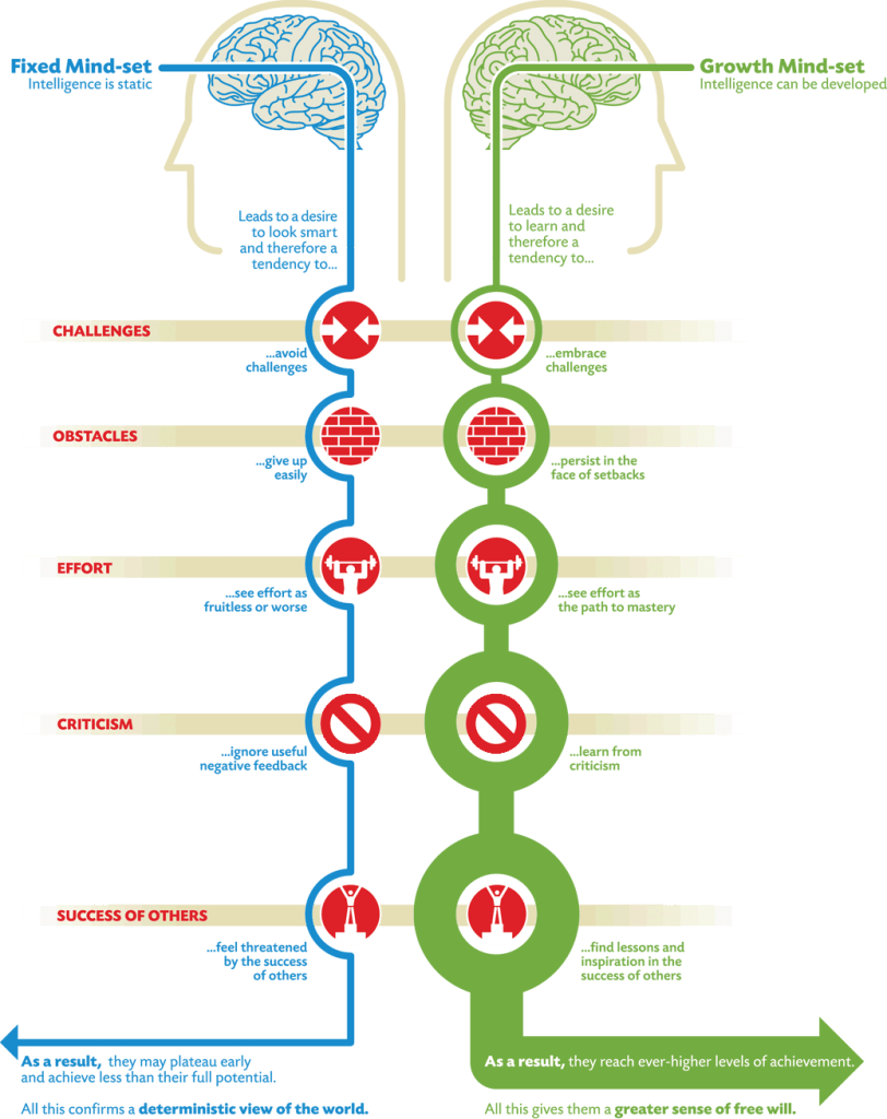 คนที่มี Fixed Mindset นั้นจะยึดที่ความสำเร็จเป็นหลัก โดยมองข้ามช่วงเวลาของการเรียนรู้ไปเลย มันมีแค่ “เป็น” หรือ “ไม่เป็น” แค่นั้น พวกเขาไม่ได้อยากเรียนรู้เพิ่ม พวกเขาแค่อยากได้ความสำเร็จนั้น ๆ การสอบครั้งนึงแทบจะเป็นตัวชี้วัดเลยว่าพวกเขา “เก่ง” หรือ “ไม่เก่ง” ส่วนคนที่มี Growth Mindset จะหาทางพัฒนาศักยภาพของตัวเองจากจุด A ไปจุด B และจุดต่อ ๆ ไปเสมอ
