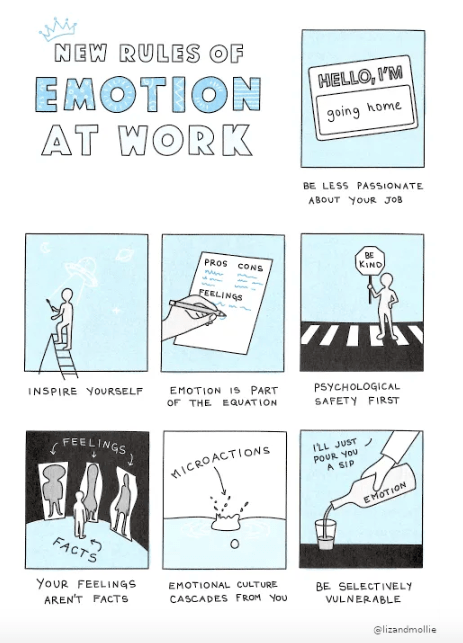 ล่าสุดมีโอกาสได้อ่านหนังสือ No Hard Feelings: Emotions at Work (And How They Help Us Succeed) เขียนโดยคุณ Liz Fosslien และ Mollie West Duffy คู่หูที่ปรึกษาองค์กรและดีไซเนอร์ โดยงานของนักเขียนคู่นี้มีดีไซน์และการนำเสนอที่เตะตา จากรูปวาดการ์ตูนลายเส้นย่อยง่าย มาพร้อมมุกตลกจิกกัดแบบน่ารัก ๆ ระหว่างทาง