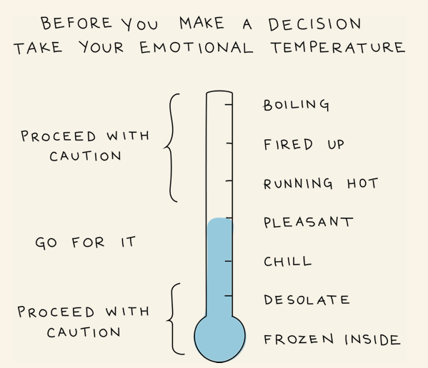 สิ่งที่เราต้องทำคือ เก็บอารมณ์ที่เกี่ยวข้องไว้ แล้วเอาอารมณ์ที่ไม่เกี่ยวข้องโยนทิ้งไป ลองดูว่า ณ ขณะที่กำลังจะตัดสินใจ มีอารมณ์อะไรผุดขึ้นมาบ้าง
